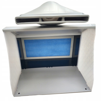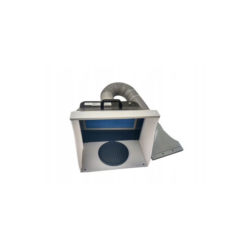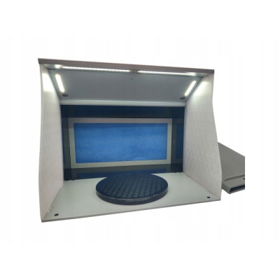 Profesjonalnie wykonana kabina malarska przeznaczona do malowania elementów mini pistoletami lakierniczymi oraz aerografami. Posiada obrotową platformę pozwalającą na wygodnie malowanie przedmiotów bez brudzenia rąk.