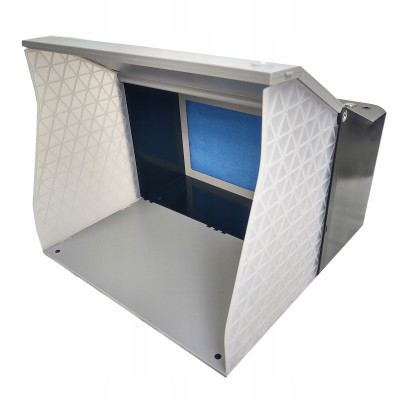 Prezentowana kabina wyposażona jest w lampę doświetlającą zwiększającą komfort pracy. W zestawie znajduje się aluminiowa rura odprowadzająca