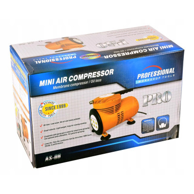 Membranowy kompresor do wszystkich aerografów oraz wybranych pistoletów do malowania ciała (solarium). Idealny do każdej pracowni modelarskiej. Posiada niezwykle dużą wydajność (68 l/min). Prezentowany model wyposażony jest filtr powietrza zapobiegający dostaniu się wody no podpiętych narzędzi pneumatycznych. Posiada również manometr do kontroli ciśnienia roboczego.