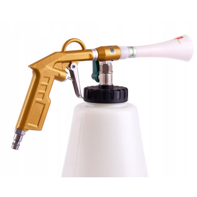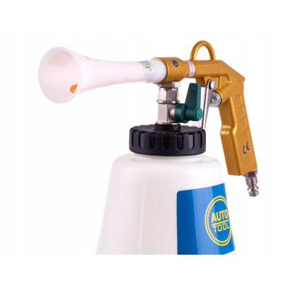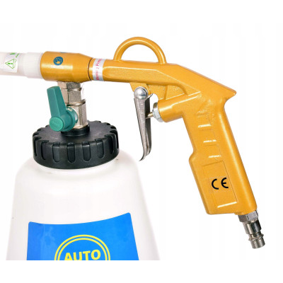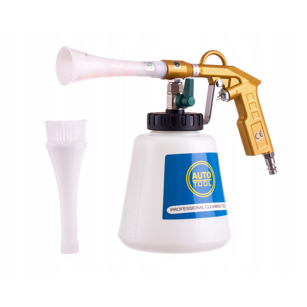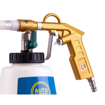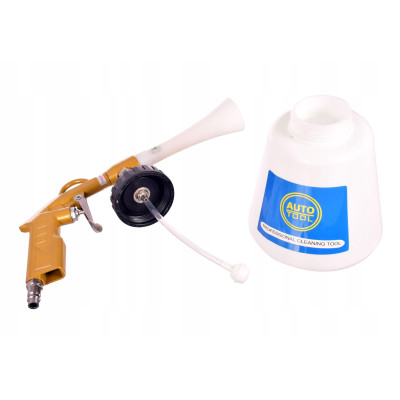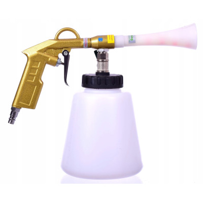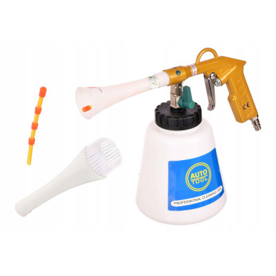 Pistoletem można wyprać fotele w samochodzie, podsufitkę, wyczyścić elementy plastikowe, bagażnik. Do prawidłowej pracy wystarczy niewielki kompresor np. 50L i płyn do prania tekstyliów. Wężyk pod wpływem ciśnienia powietrza zaczyna wibrować i wytwarza wir powietrza, który wydmuchuje brud. Dodatkowo wewnątrz pomarańczowego wężyka znajduje się cieniutki przeźroczysty wężyk, przez który można nakładać środek chemiczny. Regulacja nad zbiornikiem pozwala na dozowanie odpowiedniej ilości środka do prania. Efekty widoczne są natychmiast.