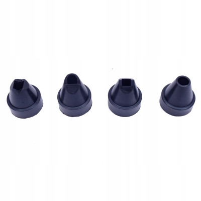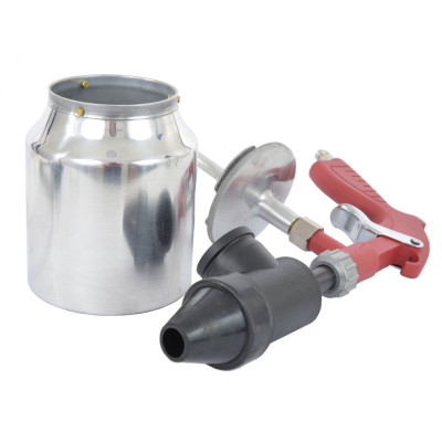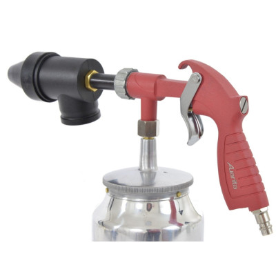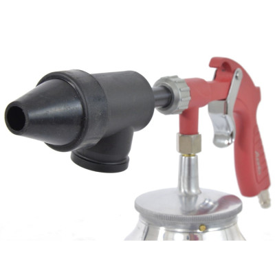 Zawarte w zestawie cztery gumowe nasadki umożliwiają punktowe i powierzchniowe prace, jak i kątowe wewnętrzne oraz zewnętrzne oczyszczanie. Wymienne dysze pozwalają na dostosowanie strumienia wyrzucanego ścierniwa do kształtu piaskowanej powierzchni oraz dowolne zmienianie kąta pracy.